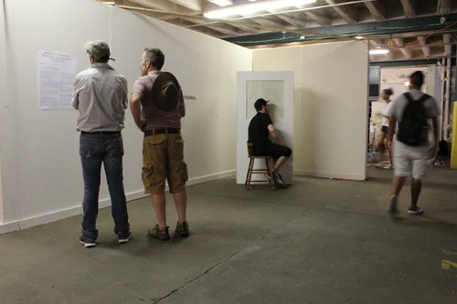 In “White Guilt Confessional” a solo exhibition by April Danielle Lewis the viewer is confronted by a participatory installation and durational performance that invites festival goers to expel any white guilt they may be experiencing in a one sided confessional booth. Here Lewis takes on the role of high priestess, shaman, mentor, father, mother and witness to the pestilent and strategic construction of white identity in the United States. The White Guilt Confessional absolves white guilt by encouraging the plagued to face, question, learn-from and transform their guilt into change in their respective spheres of influence. Reviewed: Art F City www.labbodies.com